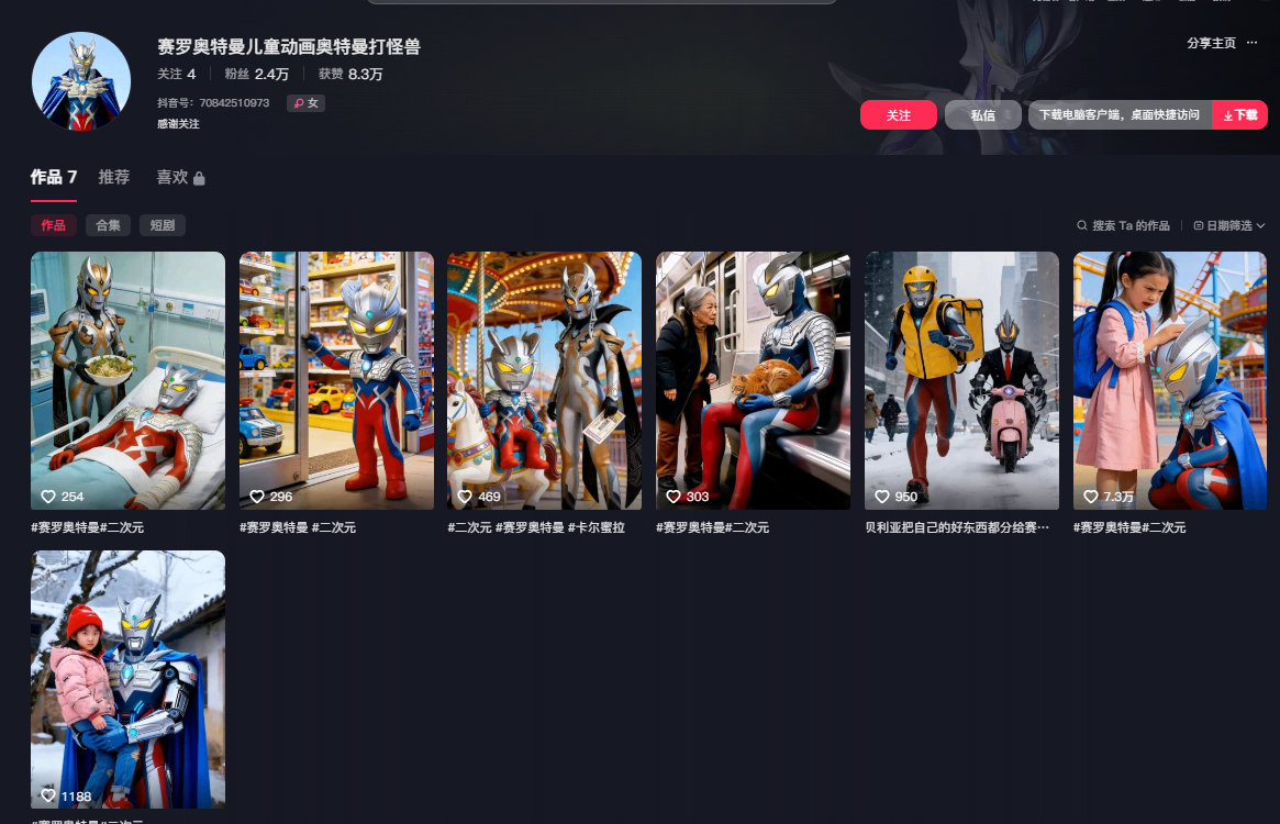 奥特曼AI动画目前涨粉速度,牛到不行,想涨粉的朋友,真的是可以尝试一下,特别是新手小白想通过自媒体发布自己的动画涨粉的朋友。这是一个大大的机会啊,大宝也新开发了一款小白工具。